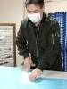 大川さんたちは「密」にならないよう、工場の駐車場や路上に集まっては打合せを重ね、かっぽう着のような前から着るデザインが決定! 小林さんが手作業で数百枚分ものポリエチレンをカット!