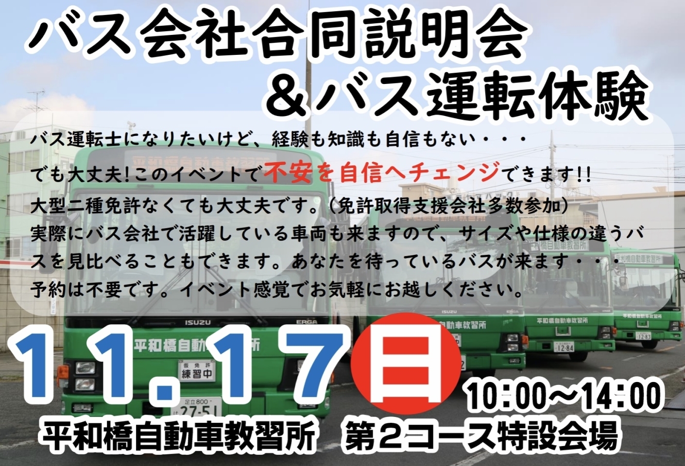 ■内容:会社説明会、車両展示、運転体験、バスに乗って教習コース乗車見学など